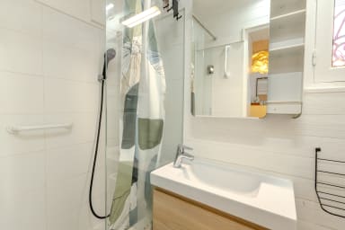 Salle de bain moderne avec baignoire/douche et rangements pratiques.