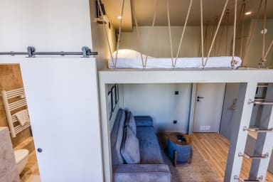 Le salon accueille un canapé convertible confortable et une télévision, parfaits pour se détendre après une journée à la plage ou une balade dans les ruelles animées d’Antibes. Au-dessus, la mezzanine abrite un lit double, offrant un coin nuit intimiste et original, comme suspendu au-dessus de l’espace de vie.