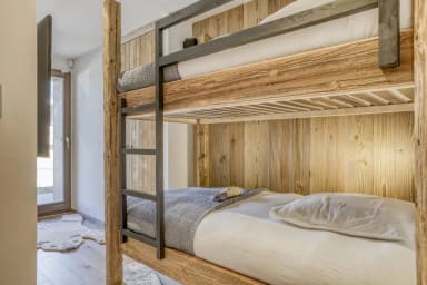 Le chalet comprend 5 chambres dont 2 suites avec salles de bains privatives, un dortoir enfants, et 5 salles de bains au total, permettant d’accueillir confortablement jusqu’à 12 personnes.