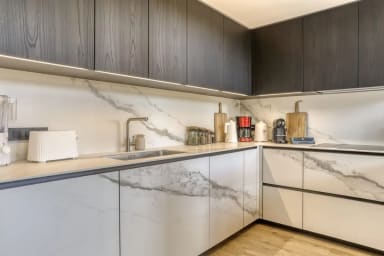 Dès l’entrée, le vaste séjour avec cheminée et grandes baies vitrées offre une vue panoramique sur les montagnes. La salle à manger et la cuisine entièrement équipée prolongent cet espace convivial et lumineux.